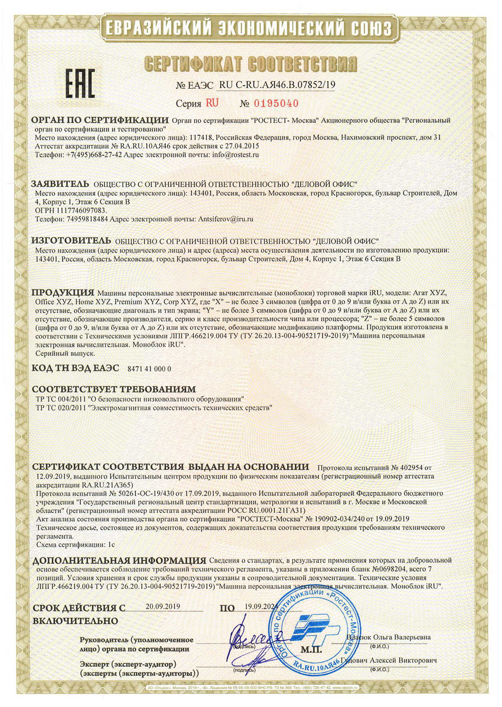 Сертификат соответствия EAC на машины персональные электронные вычислительные торговой марки iRU модели: Creato, Strato, Tactio, Planio, Corp, City, Опал (ЛПГР.466219.002)