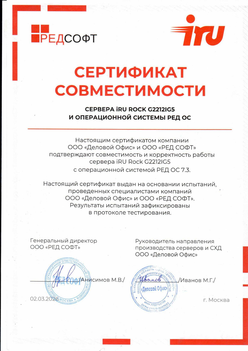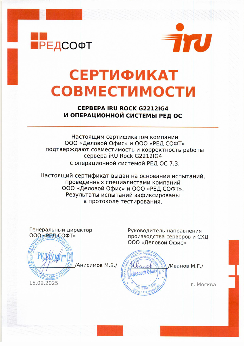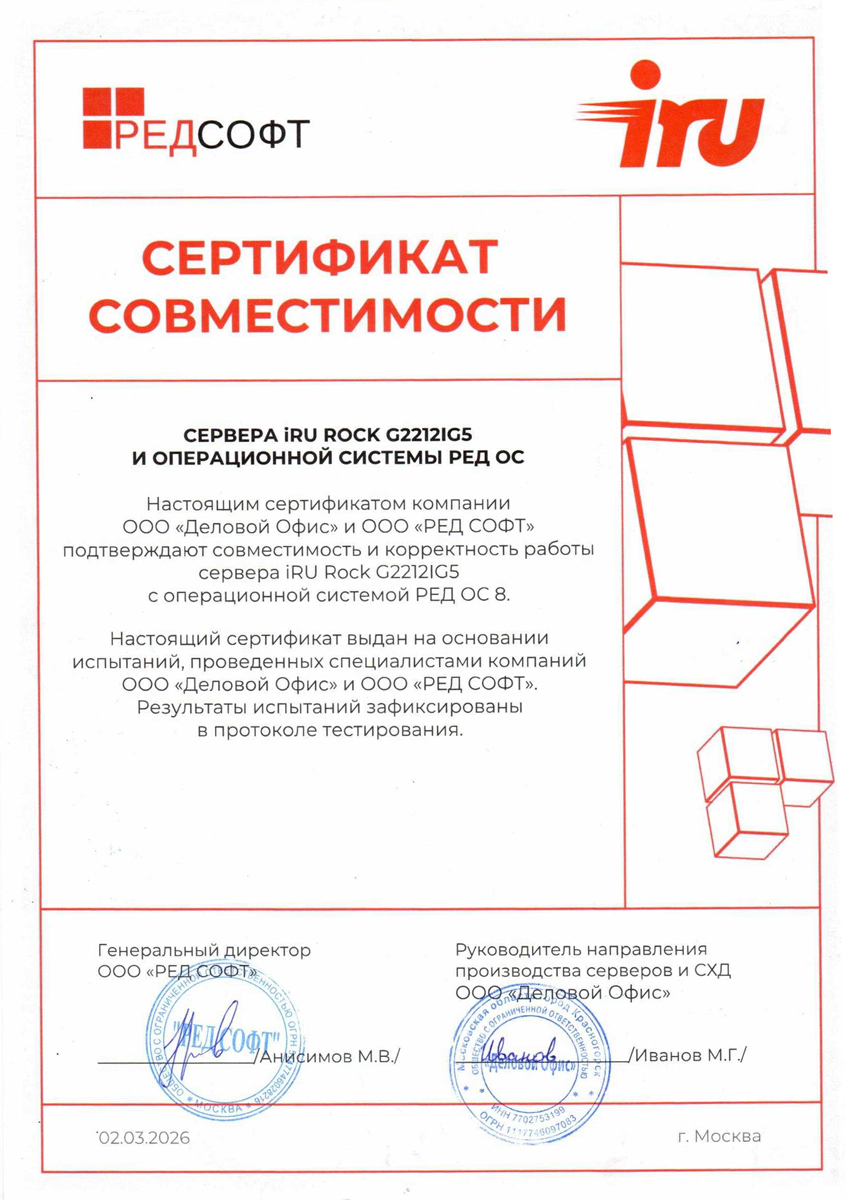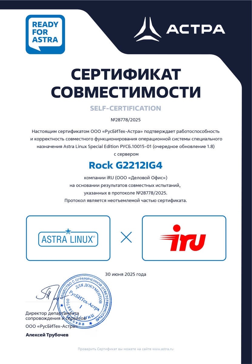 Сертификат совместимости №28778/2025 сервера iRU ROCK G2212IG4 операционной системы Astra Linux Special Edition РУСБ.10015-01 (очередное обновление 1.8)